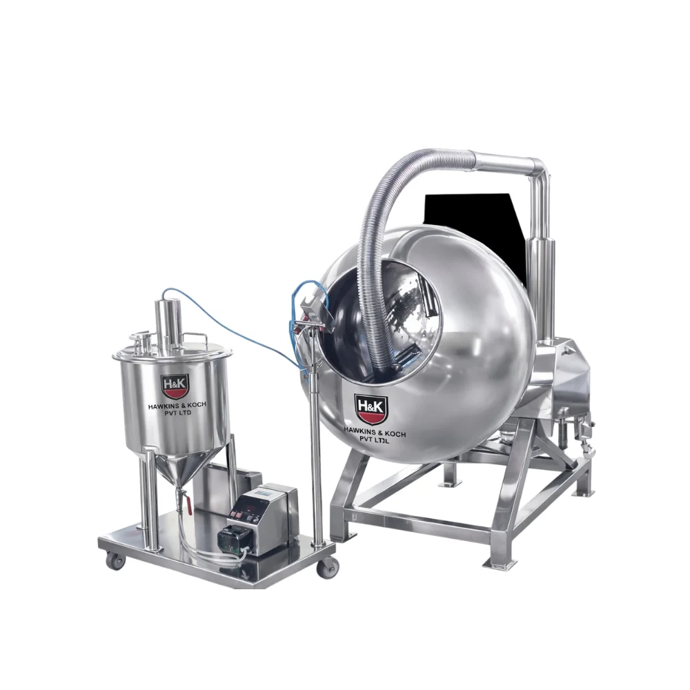 • Hot air blower to ensure faster drying of the tablets Gearbox and motor fitted in SS enclosure behind the machine
